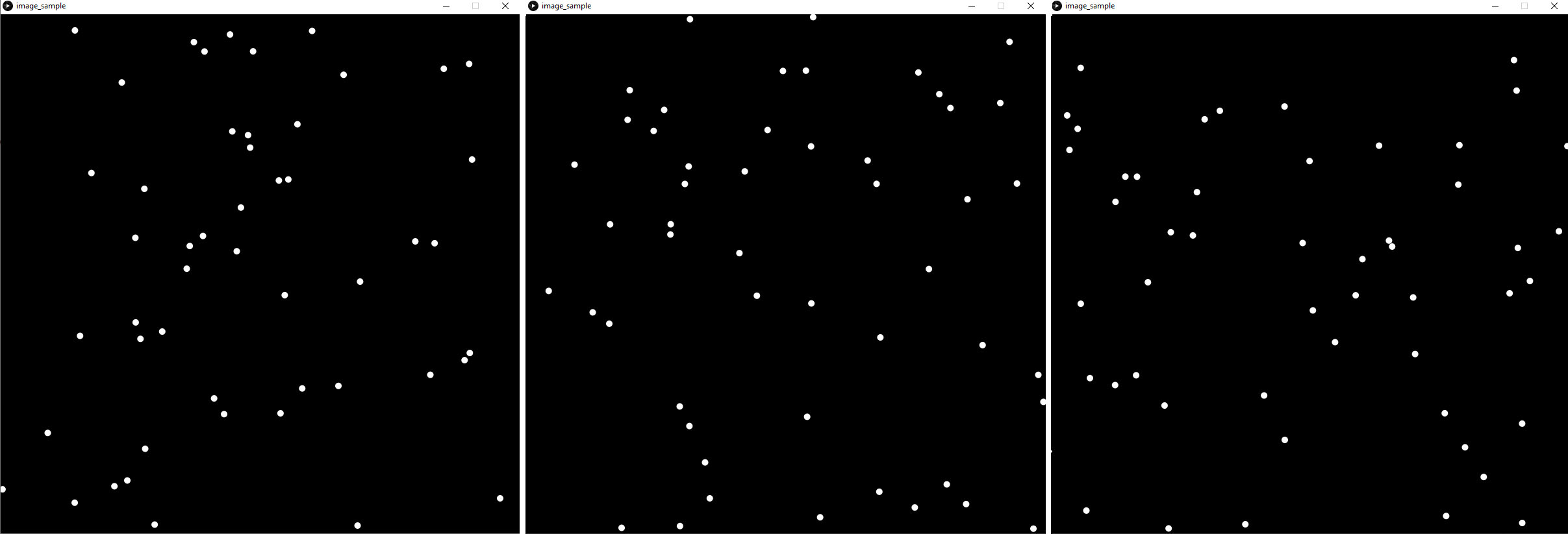 We can also try moving the points since we are using a virtual “wall” rather than a physical one. To do this we need to give each point a speed vector (in this case just x and y) when we create the original point positions. Each frame we add that speed to the current position and then reset the position. We have to check if the new point position is outside of the bounds of the sketch and if it is then we reverse the speed. Otherwise the points will quickly leave the sketch.