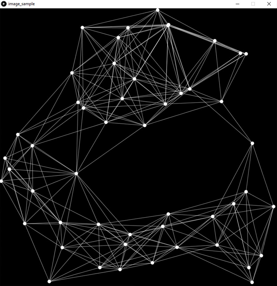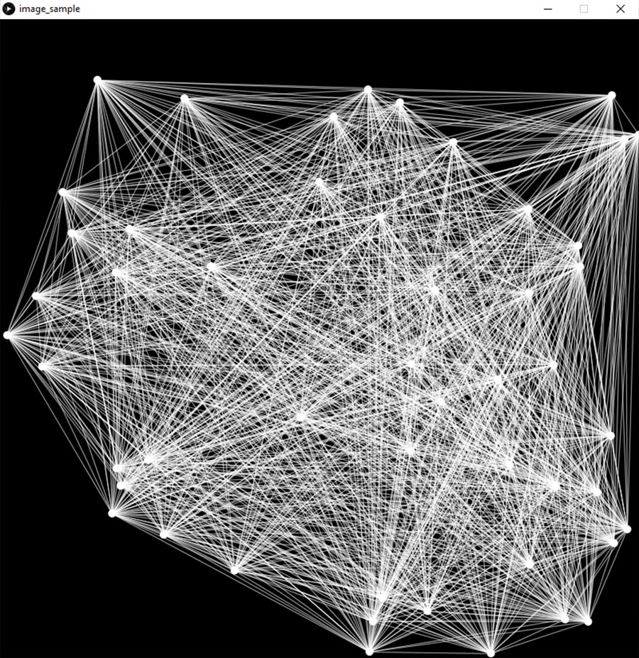 The web of lines is fairly dense. We can add another rule that would take considerable time to do by hand: Only connect points that are within a specific distance. We will do that by adding a conditional to check if the distance between to points is under a predetermined distance threshold before we draw a line between them.