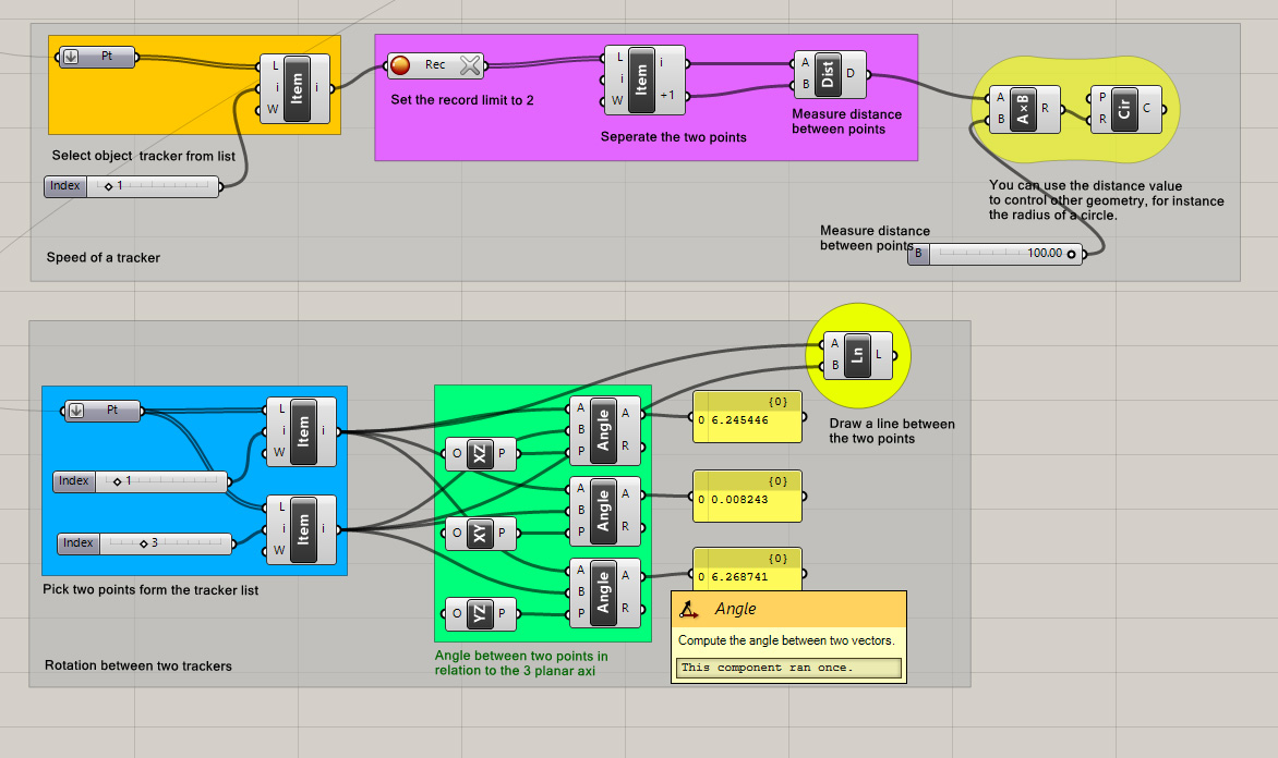 This example definition measures the speed (distance) between the latest coordinate of a tracker and the last coordinate and the rotation between two tracker coordinates based on the 3 axis.: Speed_Rotation