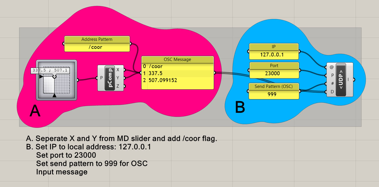 The above definition sends x and y coordinates to the processing sketch below using OSC. You can download the definition here: Rhino_to_Processing_OSC_1.zip.