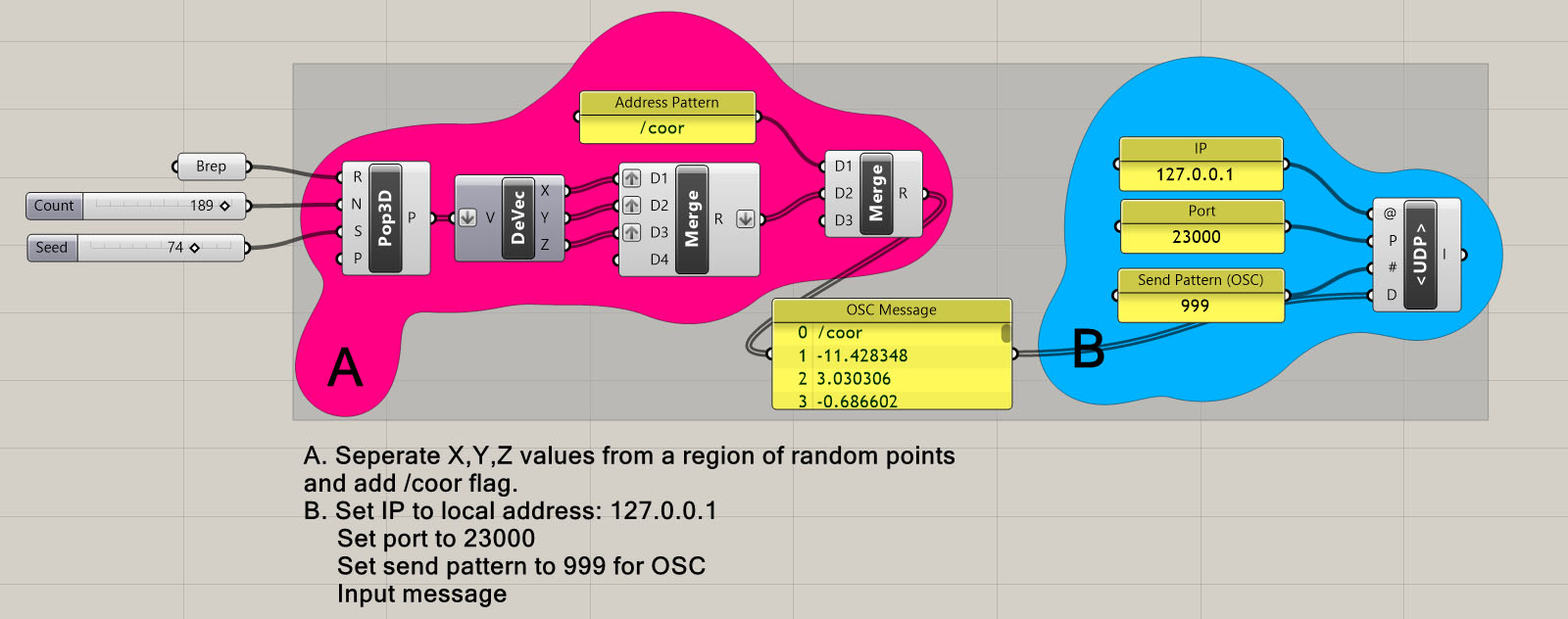 The above definition sends a message of three dimensional coordinates to the sketch below. The list of coordinates has an undetermined length. The sketch uses the data type tag to get the length of the list. The data type tag is a string with a letter for each value type. s-stirng, f-float, i-int, etc. In this case all of the coordinates are sent as strings so the list will consist of “s”s or something like “ssssssss….” To get the length of the list you can get the length of this string as each s represents a coordinate. You can download the above definition here: Rhino_to_Processing_OSC_2.zip