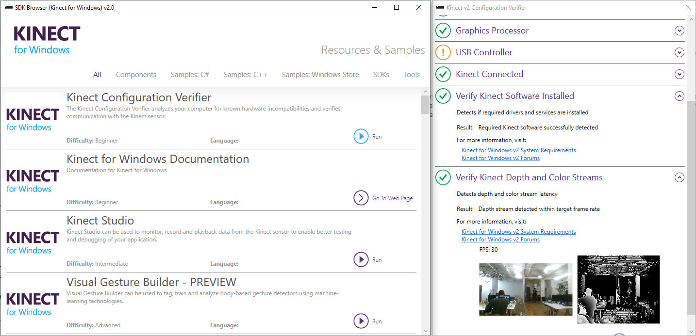 You can download the SDK for Kinect 2.0 here. Once the SDK is installed open the SDK browser and run the Kinect Configuration Verifier. Open the tab listed as Verify Kinect Depth and Color Streams to check that the depth camera is working properly