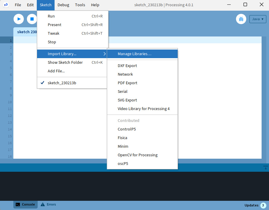 The example on this page is the basic framework for reading OSC data from Vicon Tracker. To read OSC you will need the OscP5 library installed. Below is a quick guide to install a contributed library using the Processing Contribution Manager.