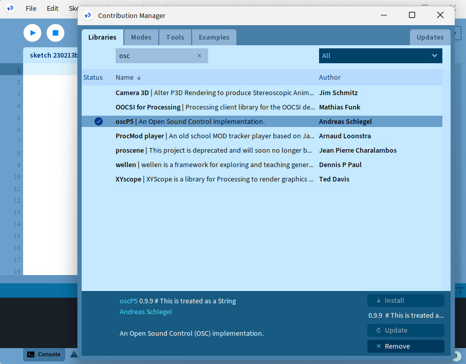 The Contribution Manager will pop up in another window. Search for OscP5 and then press install in the lower right of the window.