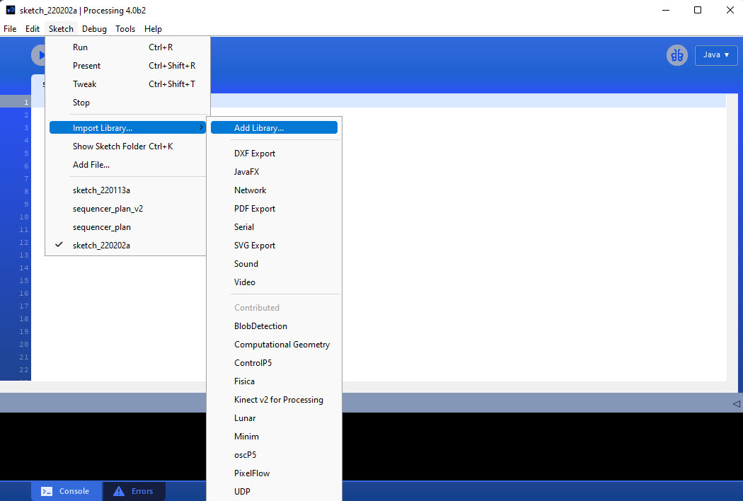 We will be using various libraries contributed by the processing community. You can add a library here Sketch>Import Library>Add Library.