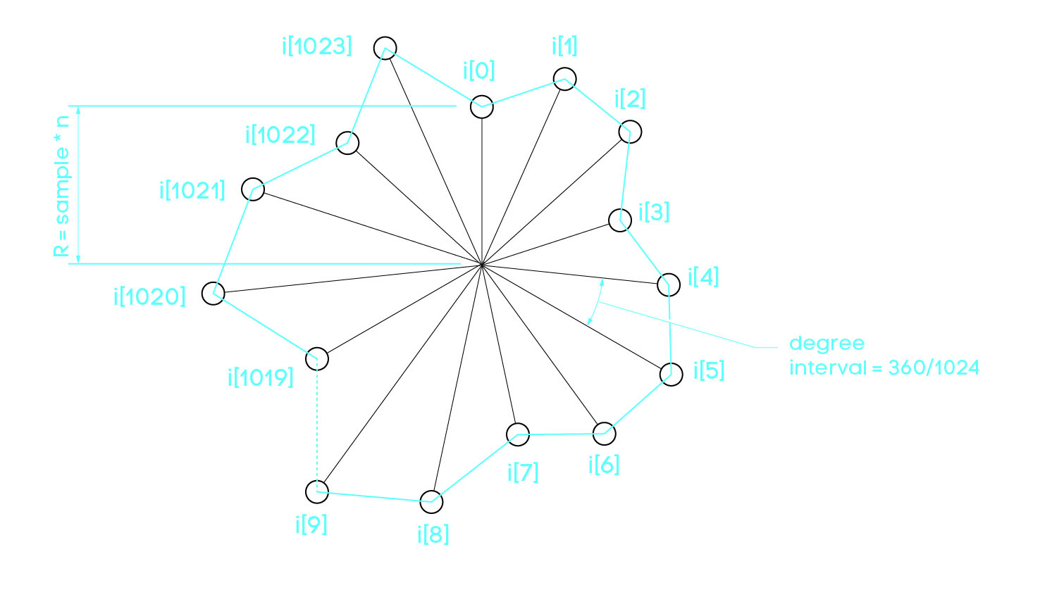 y = (sound sample * multiplier + radius) * sin( angle interval * loop counter);