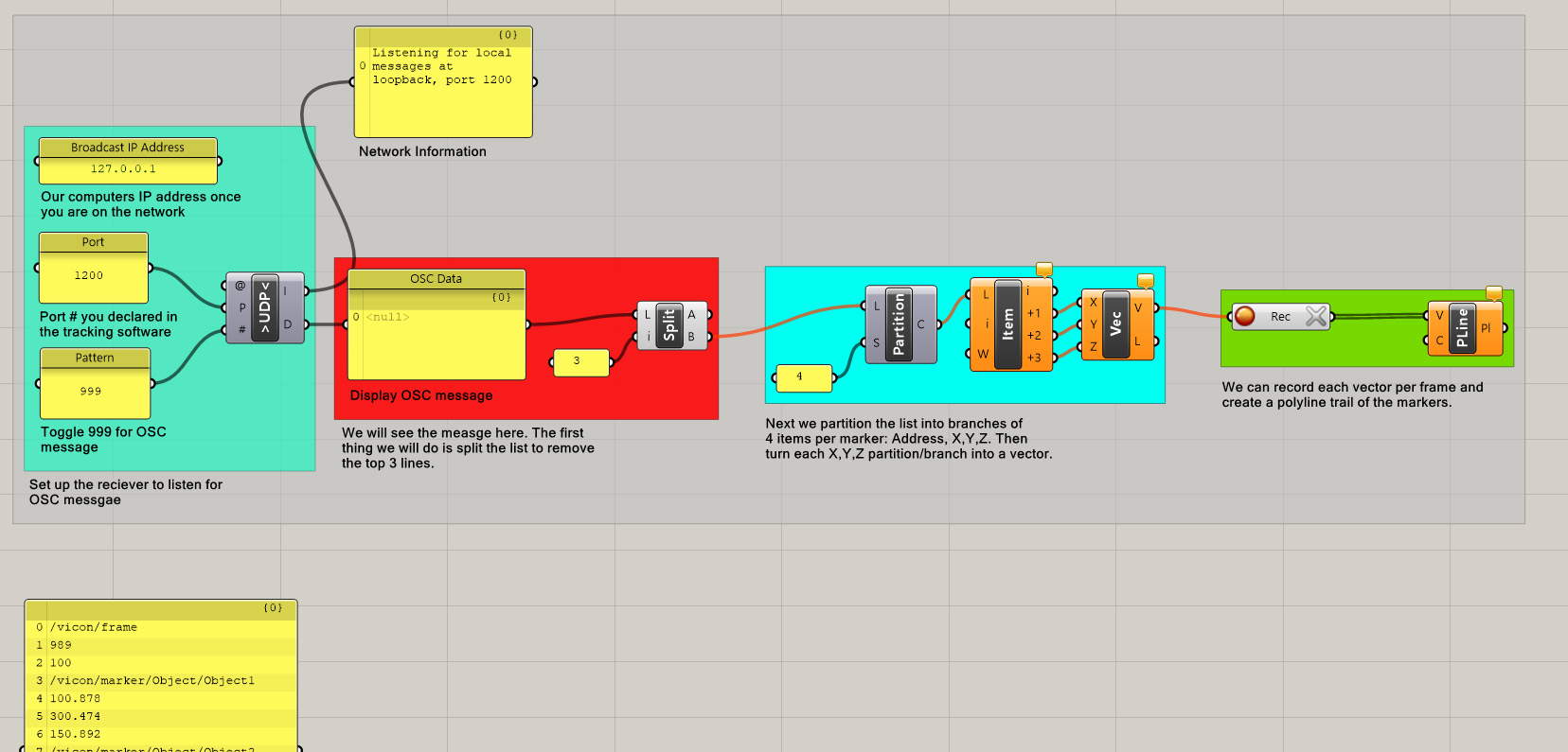 We can send data in real time from Vicon Tracker to Grasshopper using OSC. OSC or Open Sound Control is sent through a network or to your local computer using a defined port and IP address.